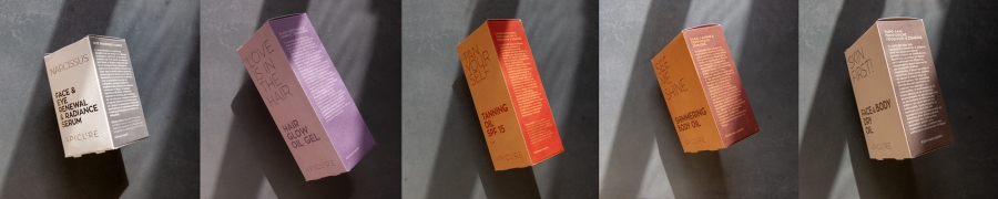 We wanted the packaging to reflect the natural ingredients and the summer spirit of the cosmetics. Each product is represented by a carefully selected colour and we chose a textured paper for the packaging itself. The combination creates a casual premium identity for the collection.